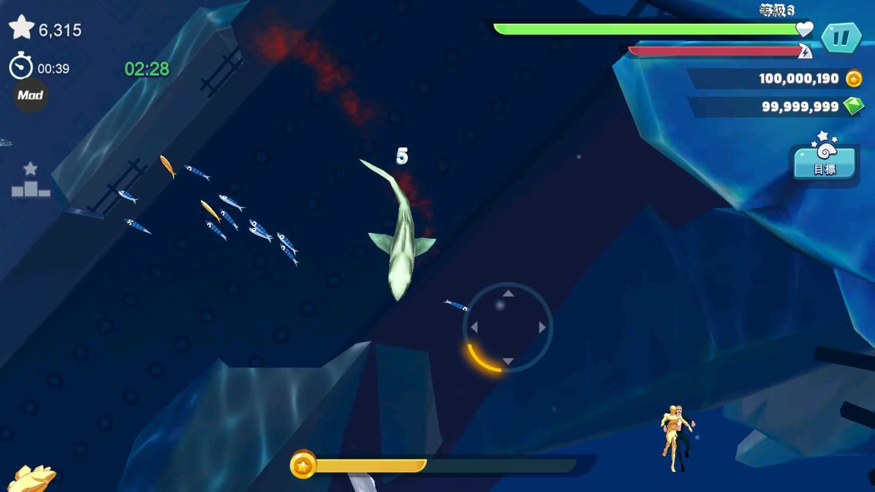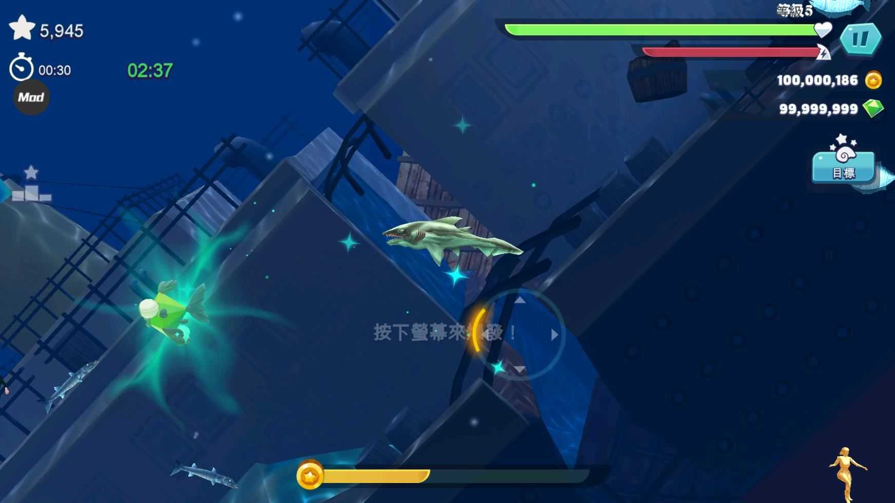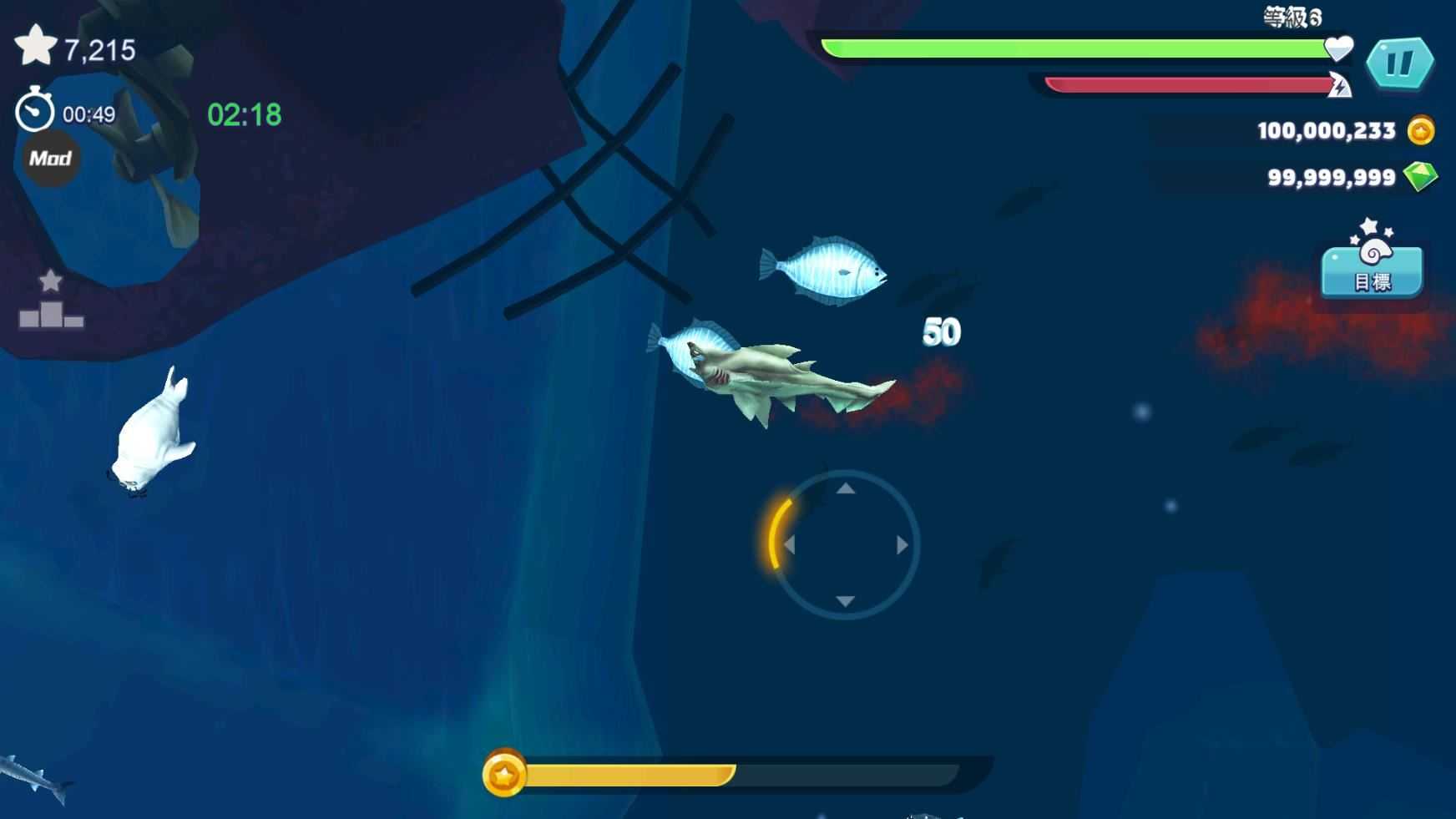 4、右上角绿色的是鲨鱼的血条,如果不吞食猎物,生命就会不断的下降。