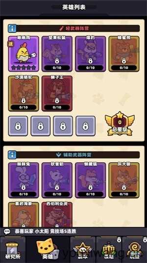 3、初始任务会赠送玩家轻重武器、辅助、毒武器各一个英雄,分别啾啾鸡,眯眯兔,田田犬,鼠小弟。玩家副本前期遇到的BOSS特殊属性抗性较少,比较需要主要输出攻击伤害,能够快速通关,建议使用主力眯眯兔+啾啾鸡的组合。