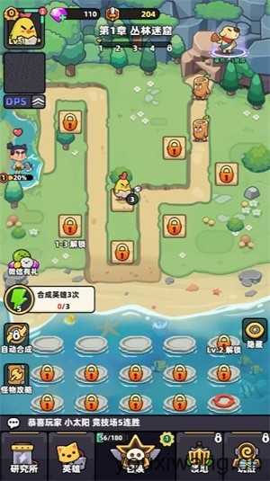 1、游戏核心玩法类似连连看机制,通过合成英雄提升属性,根据副本的不同地形来调整英雄布阵,闯关副本来获取游戏货币奖励,从而推进进度。副本中刷新怪物,优先使用群体伤害英雄放置线路出口,消耗敌对生物血量来减缓怪物对后续单位的压力,优先消灭怪物有生单位。
