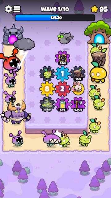 齿轮战斗(Gear Battle!),一款玩法十分新颖独特的休闲塔防手游。与传统的召唤即攻击的塔防模式不同,游戏采用了齿轮转动的全新形式来推进战斗,在游戏中,无论是召唤伙伴,还是触发各种功能道具,都需要齿轮完整的转动一圈后才可以执行,例如召唤伙伴,需要你的主角转动齿轮,带动召唤伙伴的齿轮转动一圈,这样就会出现一个伙伴一起战斗了!玩法上非常的新颖有趣,并且随着你的不断挑战,还会解锁更多功能丰富的齿轮!
