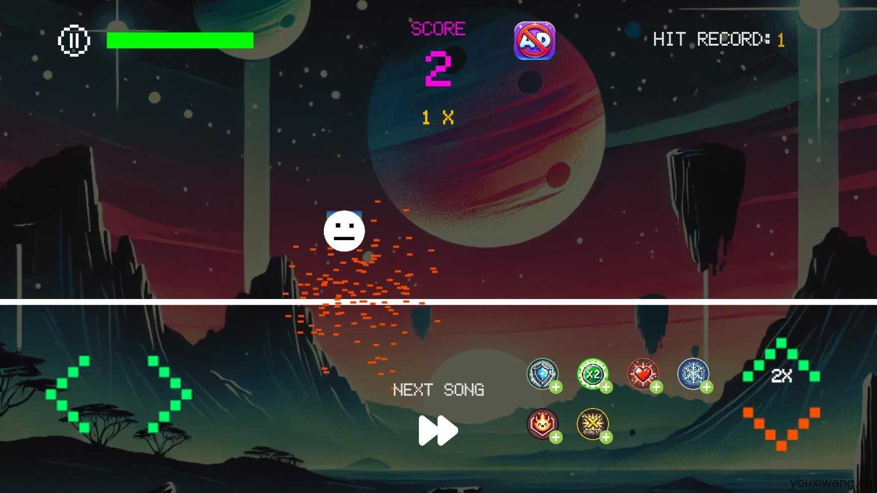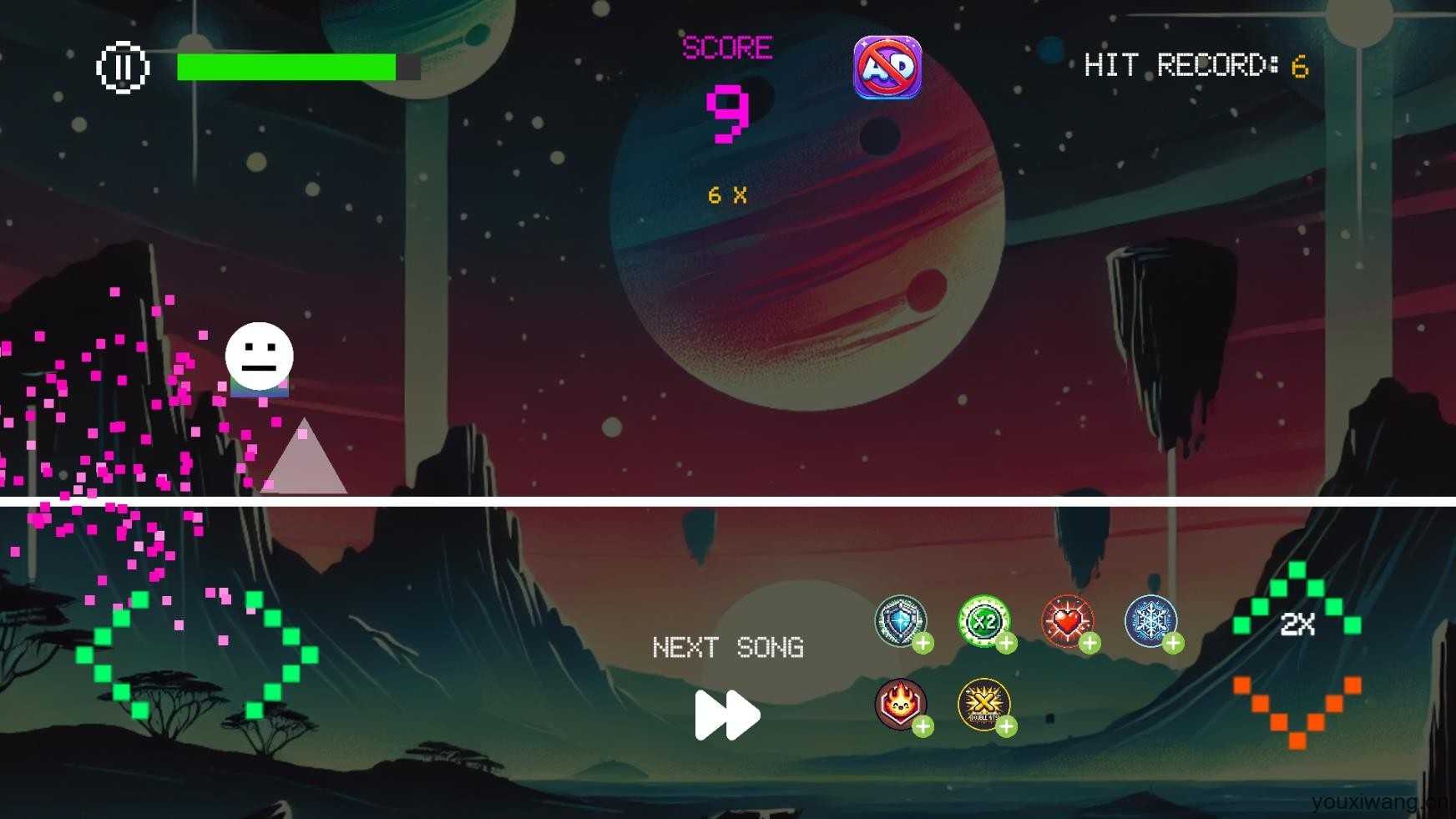 3、经典模式需要玩家控制小球跳跃避免被方块击中,屏幕左上角是玩家的血量。