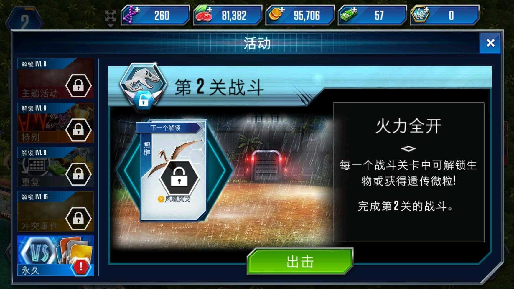 1、首先,满足1条攻击力大于150以上的恐龙,2条1级的普通恐龙的条件,然后开始战斗。