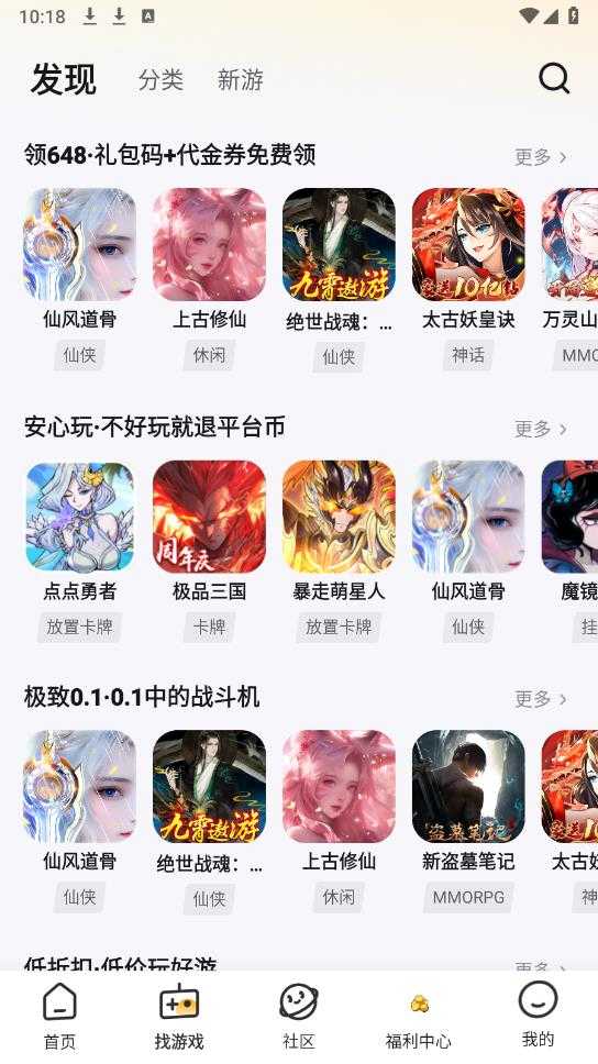游小福app,0.1折手游福利平台,内置海量爆款游戏资源,详细的分类,包括仙侠、卡牌以及传奇三国等类别,每一款游戏都有图文介绍以及使用攻略,直接下载安装皆可使用,每天不断发送礼包,是玩家必备的游戏盒子。