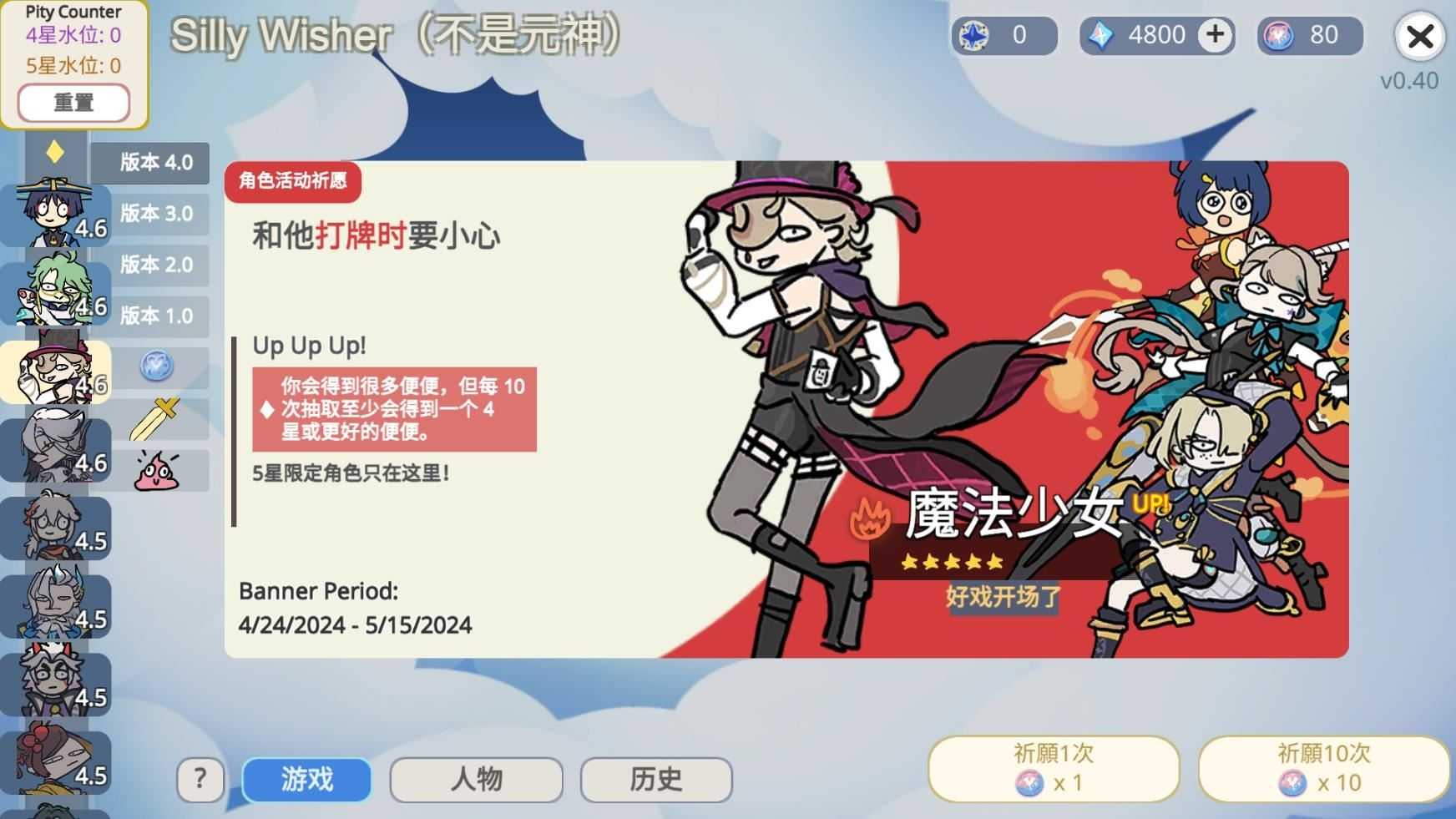 Silly Wisher,是B站UPsketchi自制的一个抽卡小游戏,玩家可以抽取到原神里的角色,游戏包含了从开服到现在所有版本的角色和武器卡池,而且所有资源全部免费,不用花费一分钱,玩家可以想抽那个角色就抽哪个角色,游戏的概率也很还原,还在等什么,快来下载看看你能多少抽出金。