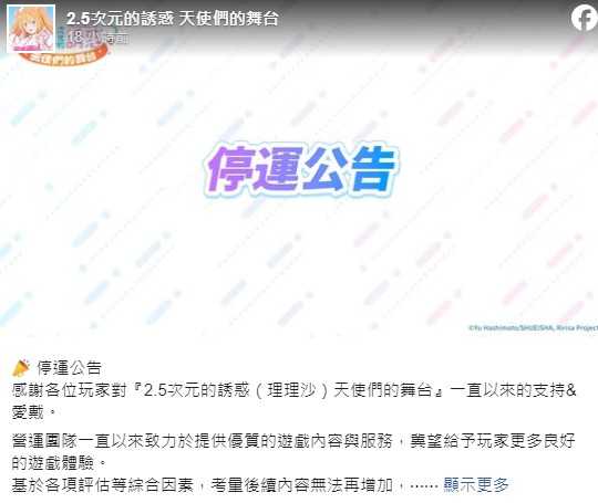 在製作人的信公开的同时,《2.5 次元的诱惑 天使们的舞台》海外版也发表了结束营运通知。官方表示,虽然这是个艰难的决定,但今后日本版会连同海外版的份继续致力于充实游戏服务。
