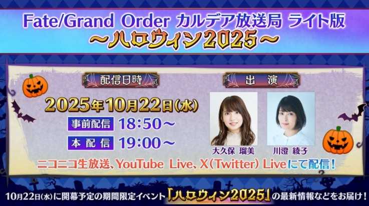 预定在 10 月 22 日将举办「Fate/Grand Order 迦勒底放送局 轻量版~万圣节 2025~」,当中声优 大久保瑠美 以及 川澄绫子将会出席带来期间限定活动「万圣节 2025」最新情报,配合直播进行的指定贴文转发达成 7 万即会圣晶石 14 个。
