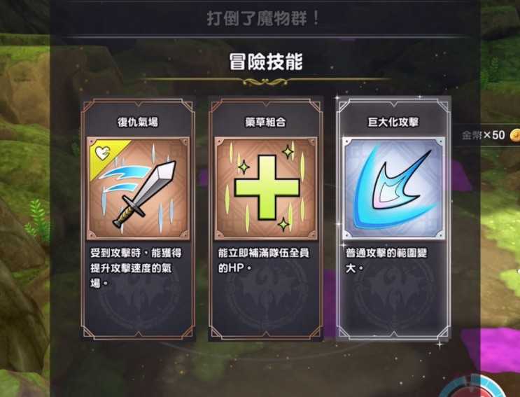 每当击败怪物累积足够经验值升级后,系统便会跳出三张「冒险技能」卡片让玩家择一,效果五花八门。