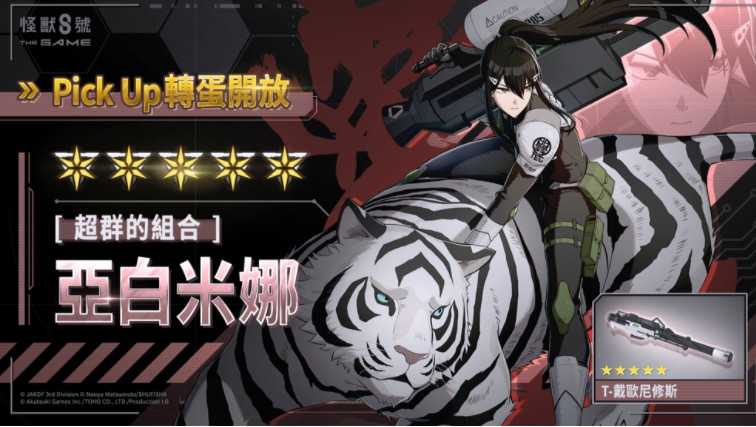 由 Akatsuki Games、TOHO 以及 Production I.G, 共同製作的智慧型手机与 PC 游戏《怪兽 8 号 THE GAME》宣布,自 11 月 1 日起开放主线剧情 5 章,并推出纪念主线剧情开放的新章活动,和最多可获得 10 张转蛋票券的 5 章开放纪念登入奖励。同时,本次更新更释出了全新 ★5 角色 —— 与伐虎并肩作战的 ★5[超群的组合]亚白米娜,其 Pick Up 角色预告片及角色剧情也正式解禁。