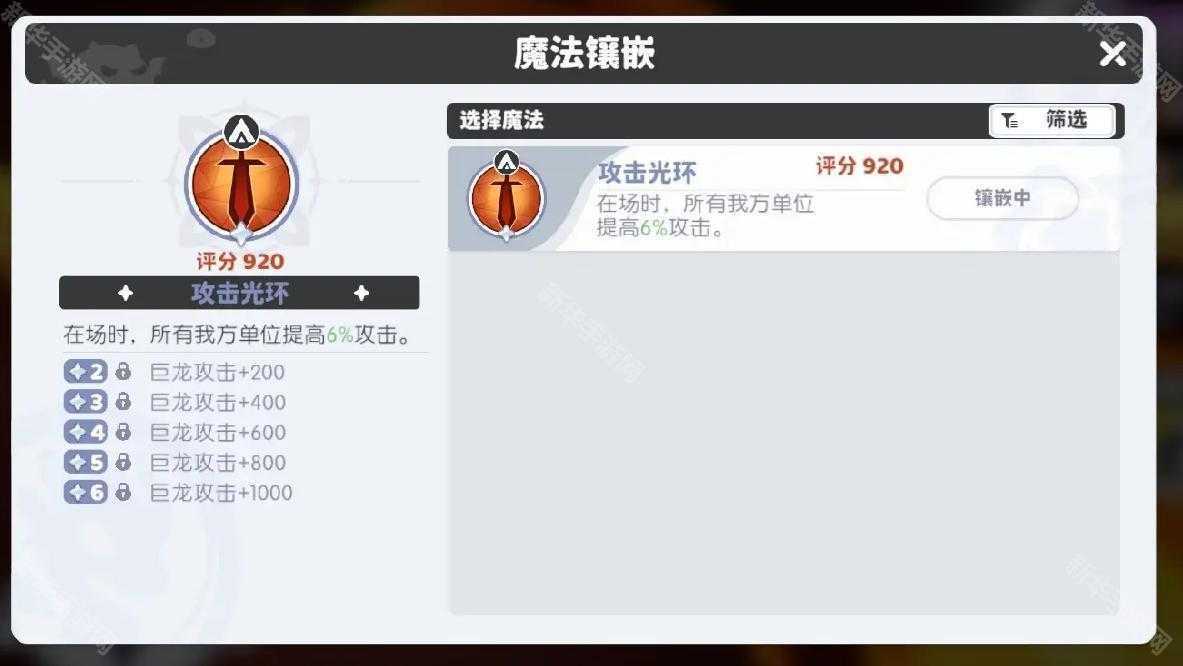 每种类型魔法只能镶嵌一个,根据队伍需求选择属性(物理/魔法输出、生存能力等)